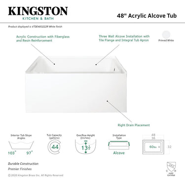Create lasting memories of bubble baths with your children or relax from the stresses of the day with a top-notch alcove tub by Kingston Brass. Extremely user-friendly with effortless installation and simplistic construction, the alcove tub is the perfect addition to your home if you are looking for pristine performance and polished refinery. The Aqua Eden 48-inch acrylic alcove tub with left hand drain hole will wholly beautify your home for years to come thanks to its durable and easily repairable acrylic construction.