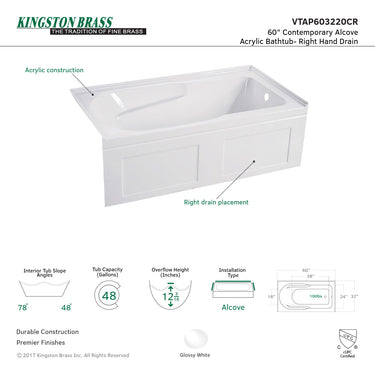 Create lasting memories of bubble baths with your children or relax from the stresses of the day with a top-notch alcove tub by Kingston Brass. Extremely user-friendly with effortless installation and simplistic construction, the alcove tub is the perfect addition to your home if you are looking for pristine performance and polished refinery. The Aqua Eden 60-Inch Acrylic Alcove Tub with Anti Skid and Left Drain Hole will wholly beautify your home for years to come thanks to its durable and easily repairable acrylic construction. Drain and overflow assembly sold separately.